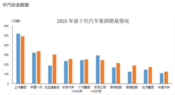 长安汽车在中汽协公布的2023年前十汽车集团销量数据中,仅次于上汽集团、一汽集团和比亚迪,位居第四位。汽车销量排名前十位的汽车生产企业(集团)共销售2571.5万辆,占汽车销售总量的85.4%。长安汽车255.31万辆的销量刚好占前十汽车生产企业总量的十分之一左右。