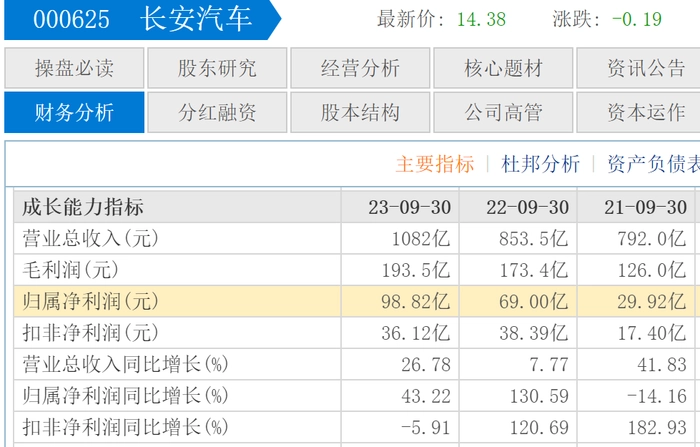2023年三季报显示,长安汽车营收1082亿元,同比增长26.78%;归母净利润为98.82亿元,同比增长43.22%。营收增幅虽然较2021年同期的41.83%有较大下滑,但同比2022年同期的7.77%却有较大提升。净利润增幅较上一年同期的130.59%下滑了87.37个百分点。