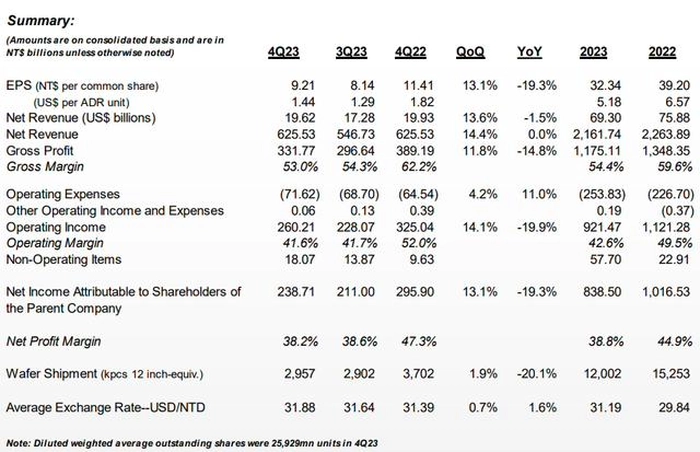 与2022年同期相比,台积电的业绩仍呈现出下滑趋势。尽管已经连续两个季度出现环比增长,但第四季度营收同比持平,净利润同比下滑19.5%。而2023年全年,台积电的营收和净利润分别同比下滑4.5%和17.6%,业绩下滑趋势明显。