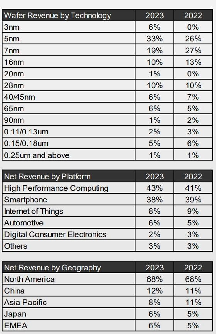 台积电副总裁兼首席财务官黄仁昭在1月18日的说明会上,将业绩改善归功于业界领先的3nm技术的应用。不可否认,3nm制程工艺的确为台积电带来了一定的收入增长。2023年四季度,3nm制程所贡献的收入占整体收入的占比扩大至15%,而先进制程(包含7纳米及更先进制程)的营收也大幅提升至全季晶圆销售金额的67%。然而,这并不能完全抵消其他业务板块的颓势。