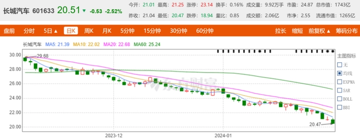 增收不增利或让长城汽车在披露快报后股价迎来一波连跌。股价从年初至今持续低迷,A股市值已经下跌超11%, 港股市值下跌超16%。截至1月31日收盘,长城汽车股价为20.43元/股,再次下跌2.90%。距2021年10月69.43元的股价高点跌幅达71%,市值蒸发约4158亿元。在如今汽车行业普遍市值在千亿的情况下,长城汽车的蒸发市值约为3.5个长安汽车和2.6个上汽集团。