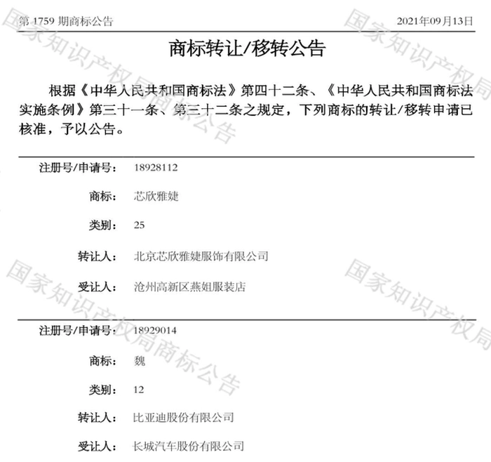 2021年9月13日,国家知识产权局商标公告显示,比亚迪将“魏”的商标转让给长城汽车。公告并未公布是免费转赠还是有偿转让,但不管是免费还是有偿,作为直接竞争对手,比亚迪能把其已经注册下来的商标,转让就是一种格局的体现,而且从比亚迪的车型来看,以中国朝代命名已经是主要趋势,自2012年开始,比亚迪就布局打造王朝系列车型,目前已采用了秦、唐、宋、元、汉这些名字和商标。“魏”作为南北朝时期北朝的开端,也在注册范围之列,只是一直未被比亚迪启用,或许更多的意义是在于防守。正是比亚迪将“魏”品牌转让长城,才有了如今的“WEY”魏牌。