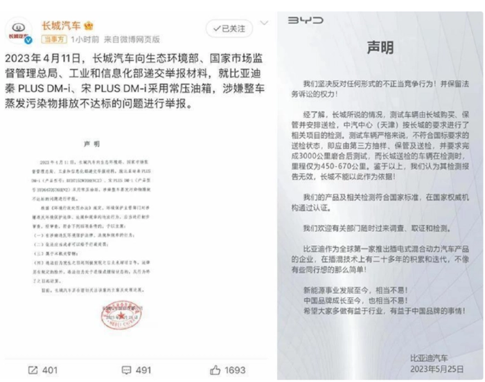 2023年4月11日,长城汽车向有关部门举报比亚迪几款车型的环保问题不达标,此举报一经曝出,瞬间引发全网热议,随后比亚迪发表声明澄清,双方的“梁子”或彻底结下。