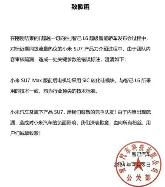 智己汽车在认识到问题后于4月9日凌晨官方发布致歉函,致歉函称“在刚刚结束的智己L6超级智能轿车发布会过程中,对标近期同级流量热议的小米SU7产品力介绍过程中,由于团队内容审核疏漏,造成一处关键参数的错误标注。小米SU7 Max版前后电机均采用SiC碳化硅模块,与智己L6所采用的技术一致,均为行业顶尖的技术标准。”致歉函还表示小米汽车及旗下产品SU7,是智己汽车尊敬的竞争队友!由于内审出现疏漏,造成对小米汽车的负面影响,智己汽车深表歉意,并向粉丝和用户致歉。