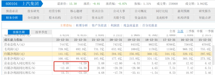 不久前上汽集团发布了2023年年报,财报显示2023年上汽集团总营收7447亿元,相比2022年的7441亿元,仅仅增长了6亿元,增幅为0.09%。同期归母净利润为141.1亿元,相比2022年的161.2亿元,下滑了20.1亿元,跌幅为12.48%。