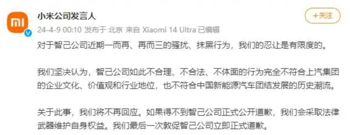 但小米对智己汽车的官方道歉和CEO个人致歉并不认可,官微连发三篇长文,声称智己汽车存在“骚扰和抹黑”的行为,认为智己汽车作为上汽旗下控股公司,其专业能力不应该如此缺失,或存在有意造谣抹黑,对智己汽车在收到公开提醒后未及时做出修正感到愤慨,强烈反对歪曲事实的造谣与抹黑,并称已经完成取证,做好依法维权的准备。