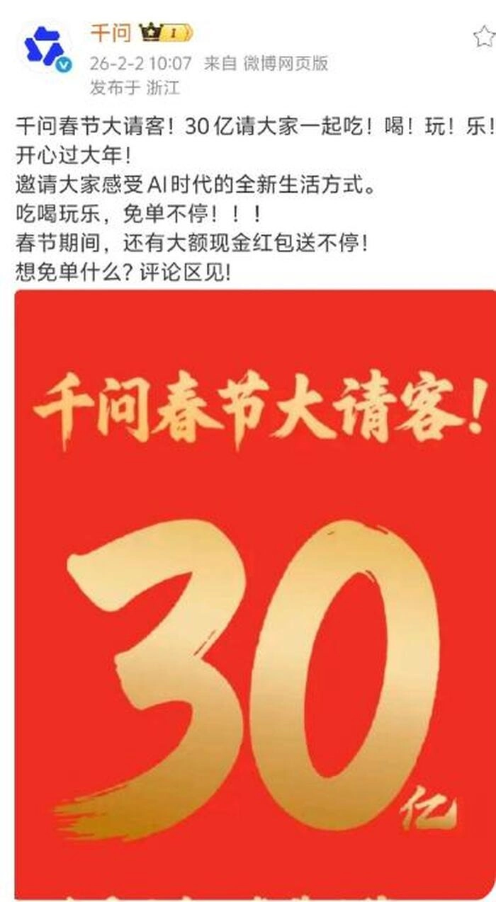 春节临近,AI大战正在持续升温。腾讯、百度、字节跳动等启动了春节红包计划,阿里千问自然也不会错过这场大战,宣布30亿元的“春节请客计划”,随后,近年来相对低调的马云也高调现身阿里千问办公楼,并对外宣布淘宝闪购、飞猪、大麦、盒马、天猫超市、支付宝等阿里生态业务将加入千问请客计划。