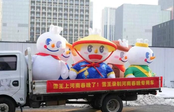 2026年再登春晚后,2月2日,郑州街头出现“雪王录制专用车”巡游,雪王坐公交、卡车去广电的画面引发社交平台热议。通过线上造势:官方微博发起#雪王上河南春晚了#话题,以“转发送香蕉撞奶”等福利联动,强化“看河南春晚,喝蜜雪冰城”的消费心智。彩排期间出现 “十四个不同造型的雪王天团”,形成规模化视觉冲击,强化IP的家族感与全球属性。蜜雪冰城延续接地气风格,通过舞蹈与年轻化互动,承担拉近春晚与年轻观众距离的功能。连续两年登台持续巩固“本土骄傲”的品牌形象,实现文化价值与商业价值的双向赋能。