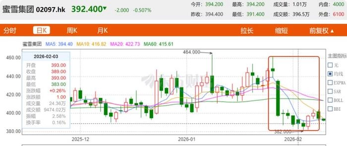 从蜜雪冰城上河南春晚至今,其股价没有明显的上涨,但却止住了此前连续多个交易日下滑的颓势,截至2月9日收盘,蜜雪冰城股价再跌1.4%,最新市值1497亿港元,相比去年6月618.5港元的股价高点下跌了36.2%,市值减少了近千亿港元。
