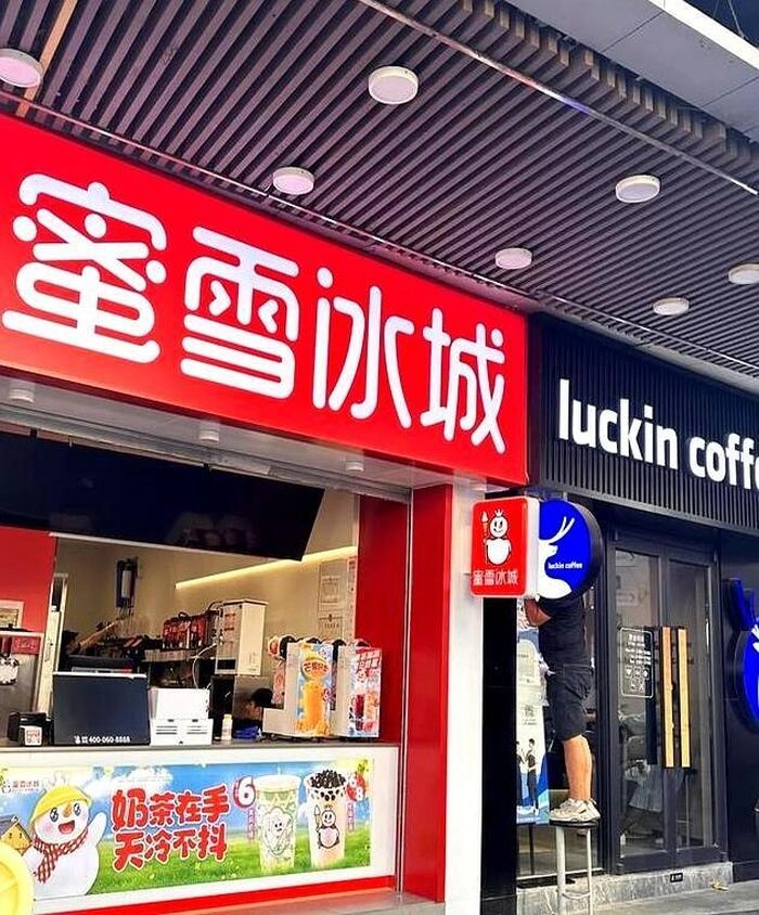 蜜雪冰城是善于学习的好学生,跟着瑞幸走,瑞幸开到哪里,他就在旁边开店,简单粗暴。而且蜜雪冰城的开店速度远高于瑞幸。