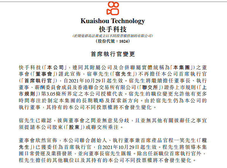 和其他企业的单核心领导层不同,快手从成立至今一直实行双核心管理模式。